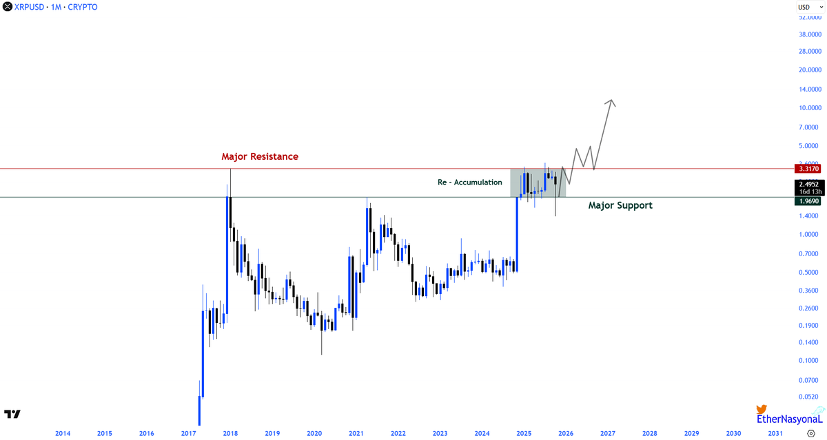 On the XRP/USD chart, the asset continues to move between $2 and $3.3. These are the highs from 2021 and 2017, respectively. According to analyst EtherNasyonaL, XRP remains in a reaccumulation phase. They wrote,