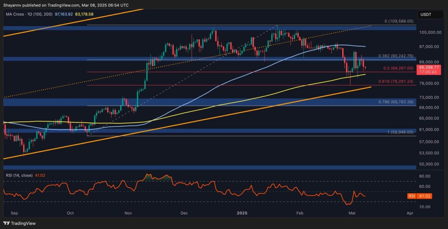 Bitcoin is currently testing a crucial support zone at the 200-day moving average ($83K) and the 0.5 Fibonacci retracement level. The price action near this range is critical and decisive for the market, as a bearish breakdown could trigger a major sell-off.