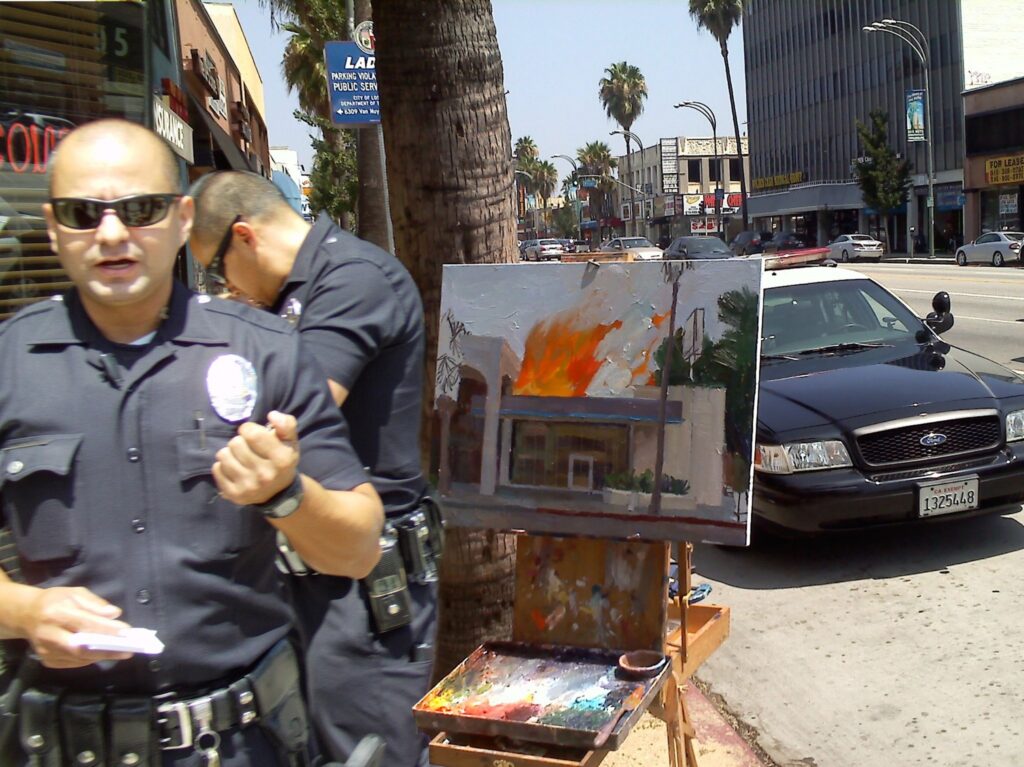 Alex: In 2009 I had been (and continue to enjoy) “plein air” painting which means working on location outdoors directly from life; it’s very much associated with the French Impressionists and it’s a very enjoyable thing to do. Since I was living in LA at the time, my favorite motif to paint was urban landscape and I was often set up with an easel and art supplies on the sidewalk so I was used to making art in public. Also in 2009 I was starting to really pay attention to financial news and began a learning process about it that continues to this day. At the time I slowly began to think that the 2008 FiNaNciAL cRiSiS!!1! and subsequent trillion dollar bailouts were not what we were made to believe. Add to this a friend telling me about a show called the Keiser Report. Now Max and Stacy, along with all sorts of news and information on YouTube, are educating me with wit and insight about what was exactly happening. I could only draw one conclusion: This was a crime spree and not only were the perpetrators getting away with it, they were getting paid. Outrageous. AntiAmerican, AntiCapitalist, Anti-Law and Order. A couple years later and duly radicalized, I was seeking a way to express my outrage. I was plein air painting a lot, especially with a friend who lived in Van Nuys. In his neighborhood I saw this Chase Bank that used to be a Washington Mutual that used to be a Home Savings and Loan and it was this beautiful Millard Sheets designed mid-century modern building. That was the eye chocolate falling into the peanut butter of my mind: I am going to paint en plein air this Chase bank like the roof is on fire. One day later I took the following photo:
