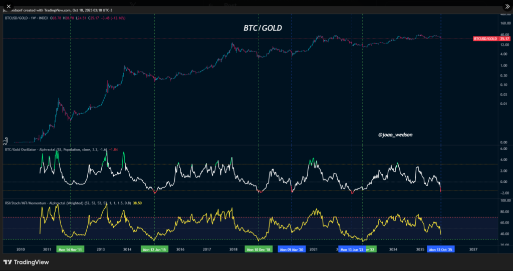 Wedson’s chart shows two tags — one blue and one green — that line up with a normalized oscillator he says is at a low. According to him, the blue tag marks a bottom in the BTC/Gold ratio while the green tag appears when both indicators reach lows together.